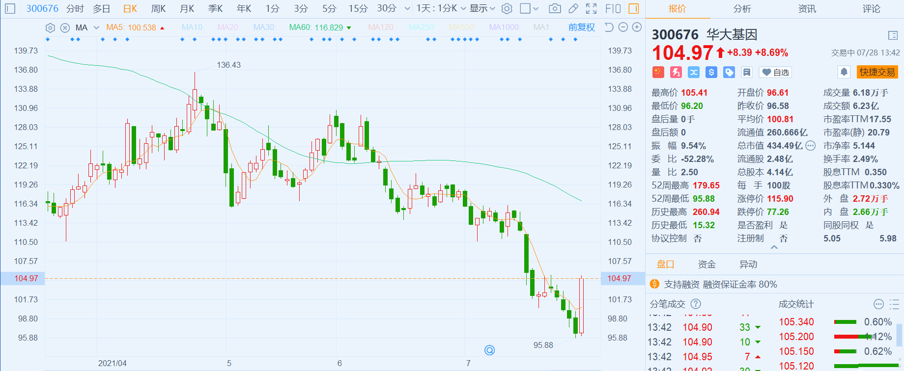 华大基因(300676.SZ)午后大幅拉升,现涨幅扩大至8.69%,报104.97元,总市值434亿元。