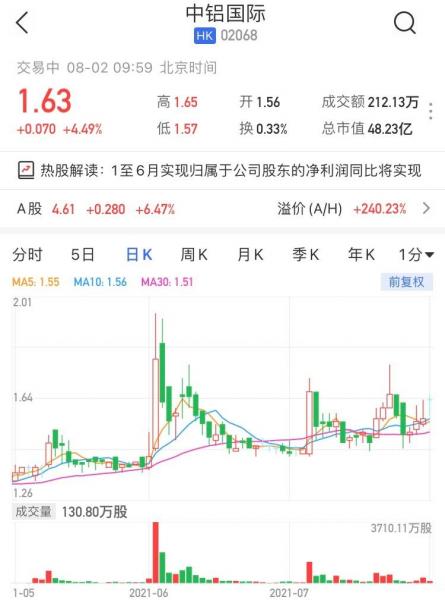 中铝国际(2068.HK)现报1.63港元,涨4.49%,最新市值48亿港元;中铝国际(601068.SH)现亦涨超6%,报4.61元。