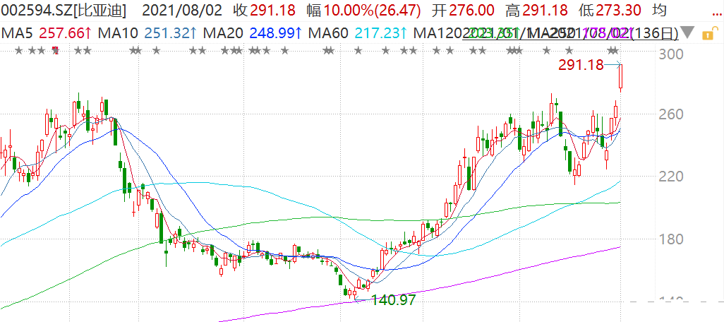 比亚迪(002594.SZ)尾盘封涨停板报291.18元,创历史新高;H股目前涨超8%报260港元,逼近今年1月份的历史最高价278.149港元。比亚迪目前总市值7544亿元,即将超过中国石油。