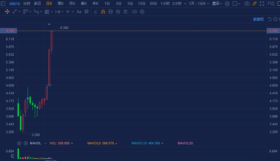次新股环球新材国际(6616.HK)再度拉升涨10.19%,6日涨幅超60%。报6.38港元创上市以来新高,较发行价3.25港元近乎翻倍,总市值达75亿港元。