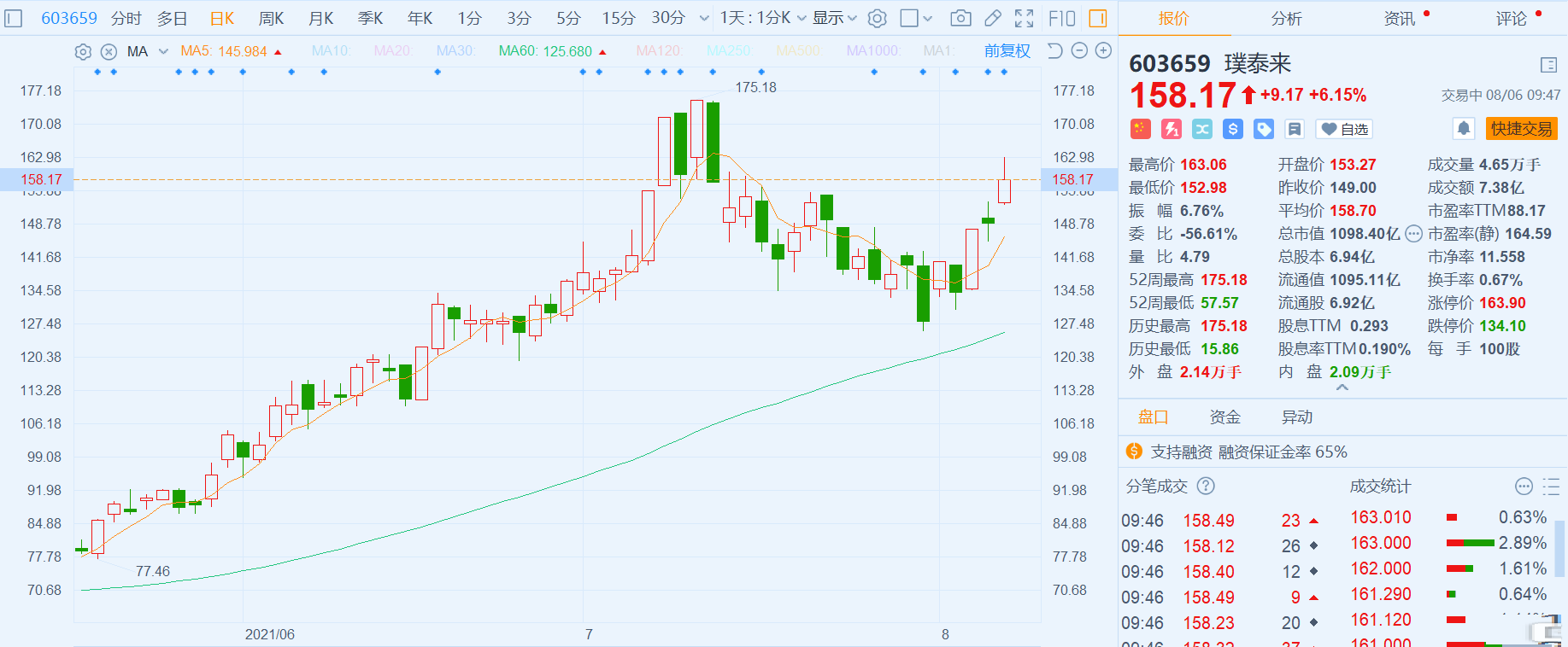 璞泰来(603659.SH)高开高走,现涨幅扩大至逾6%,报158.17元,总市值1098亿元。璞泰来昨