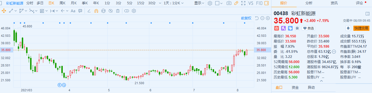 彩虹新能源(0438.HK)股价快速拉升,现报35.8港元,涨幅7.19%,最新总市值63.12亿港元。