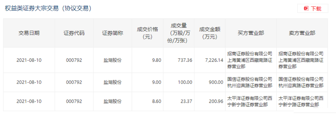 周二回归的盐湖股份发生三笔大宗交易,成交价分别为8.6元,9元和9.8元,而盐湖股份回归首日的收盘价达到了35.9元。也就是说,大宗交易的最大折价超过76%。