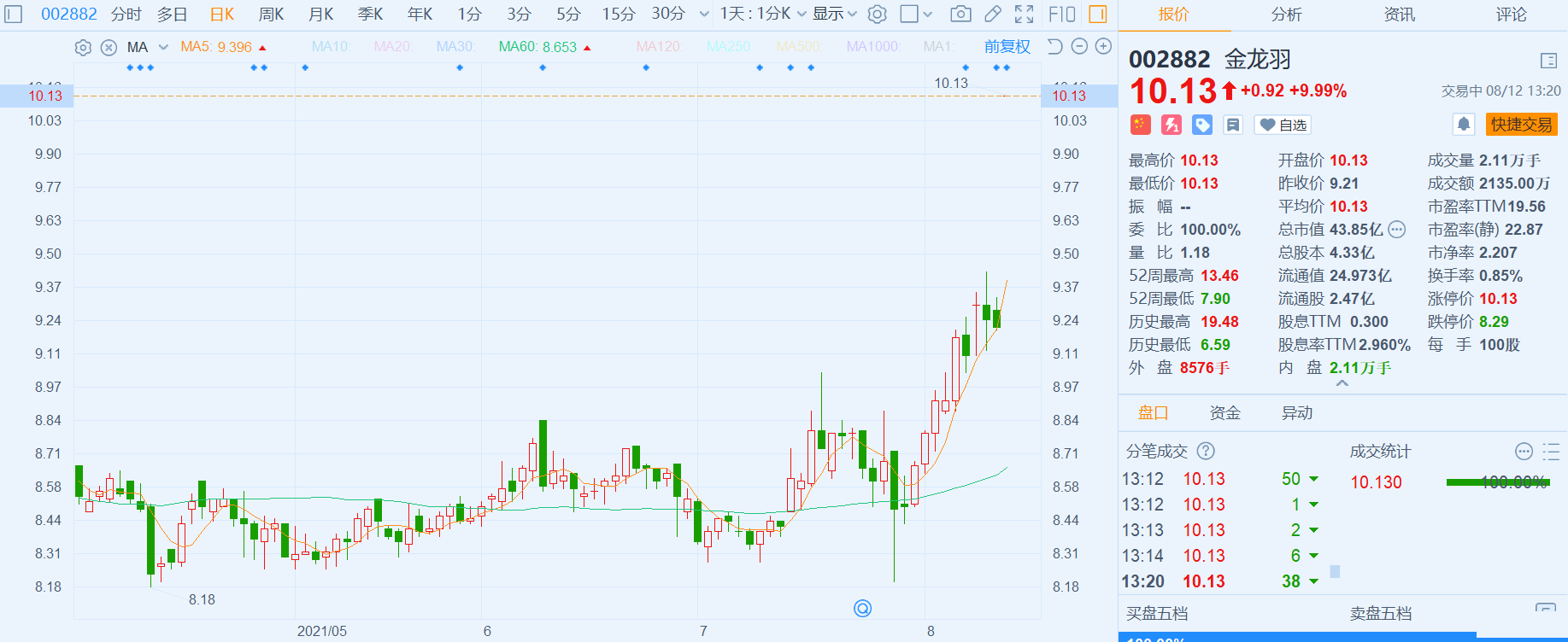 金龙羽(002882.SZ)一字涨停,报10.13元,股价创近10个月新高,买一封单达16万手,总市值44亿元。