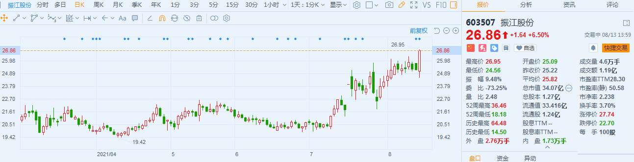 振江股份(603507.SH)股价持续拉升,现报26.86元创去年10月份以来新高,涨幅6.5%,最新总市值34.1亿。