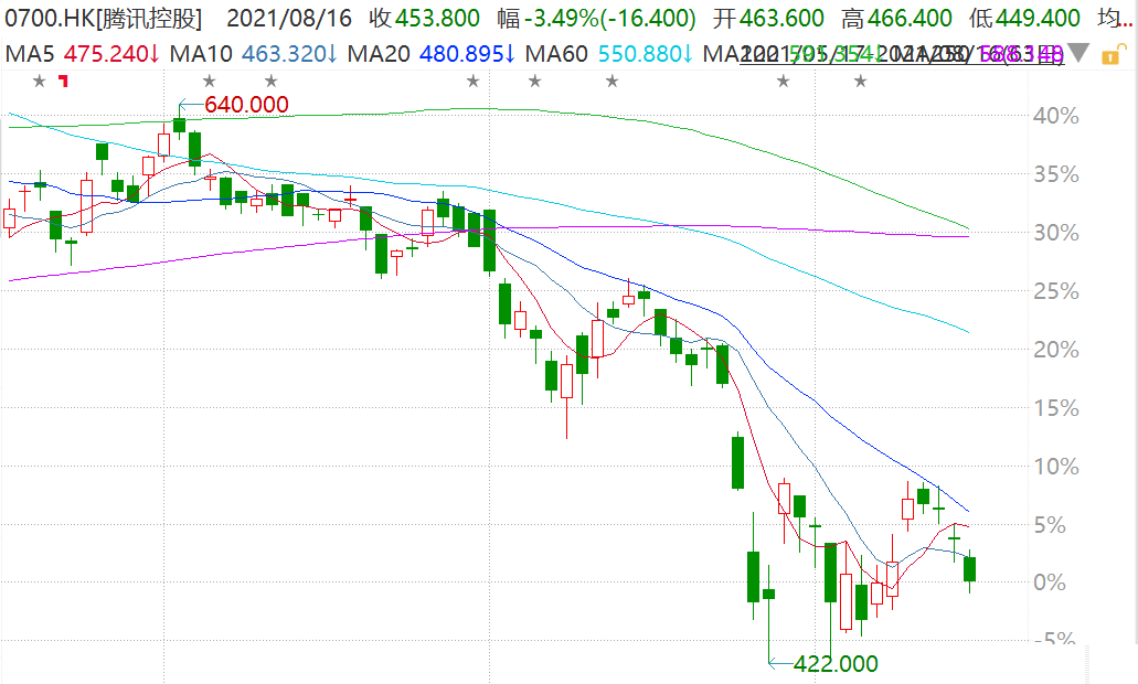 腾讯今日低开低走,盘中一度跌4.42%报449.4港元,市值4.31万亿港元。