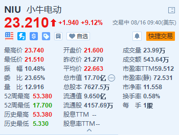 小牛电动(NIU.US)股价高开高走,现报23.21美元,涨幅9.12%。