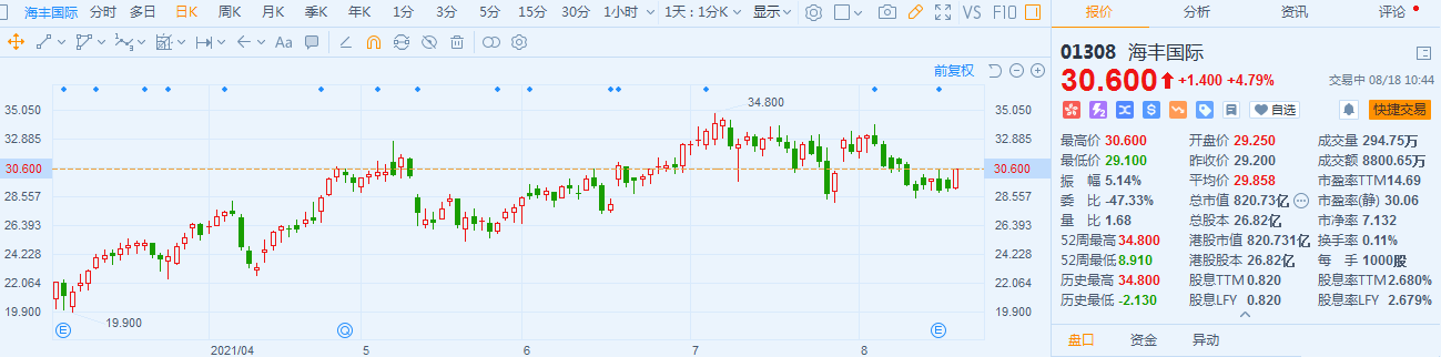 海丰国际(1308.HK)股价持续拉升,现报30.6港元,涨幅4.79%,最新总市值820.7亿港元。