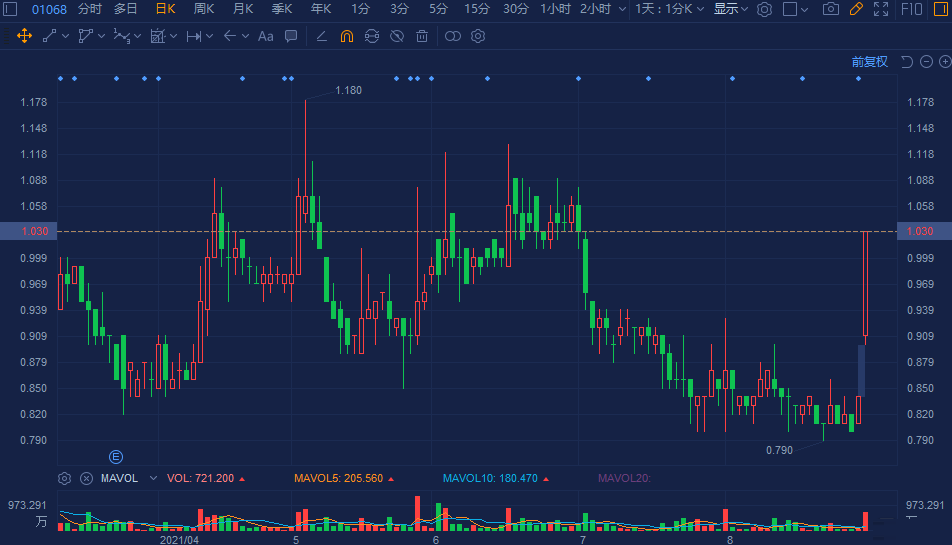 雨润食品(1068.HK)跳空高开,大幅涨超22%居港股市场榜首。最高报1.03港元创近2个月新高价,总市值19亿港元。