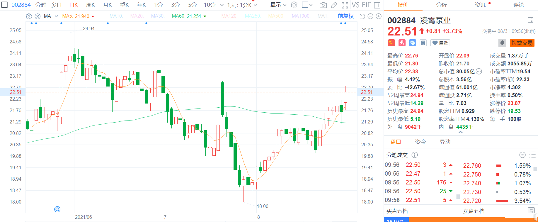 凌霄泵业(002884.SZ)涨约4%,报22.51元,总市值80亿元。