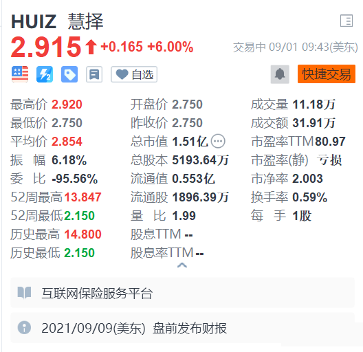 昨日大幅收涨13.17%的慧择(HUIZ.US)今日继续走高,现涨6%报2.915美元。