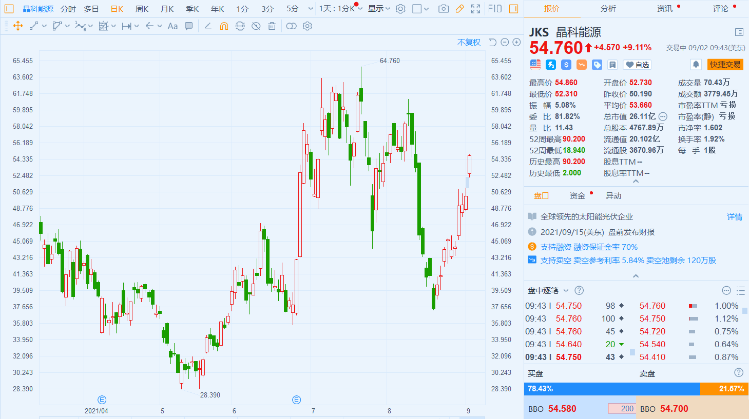晶科能源(JKS.US)大幅走高,现涨幅为9.11%,报54.76美元,暂成交3779.45万美元,最新总市值为26.11亿美元。