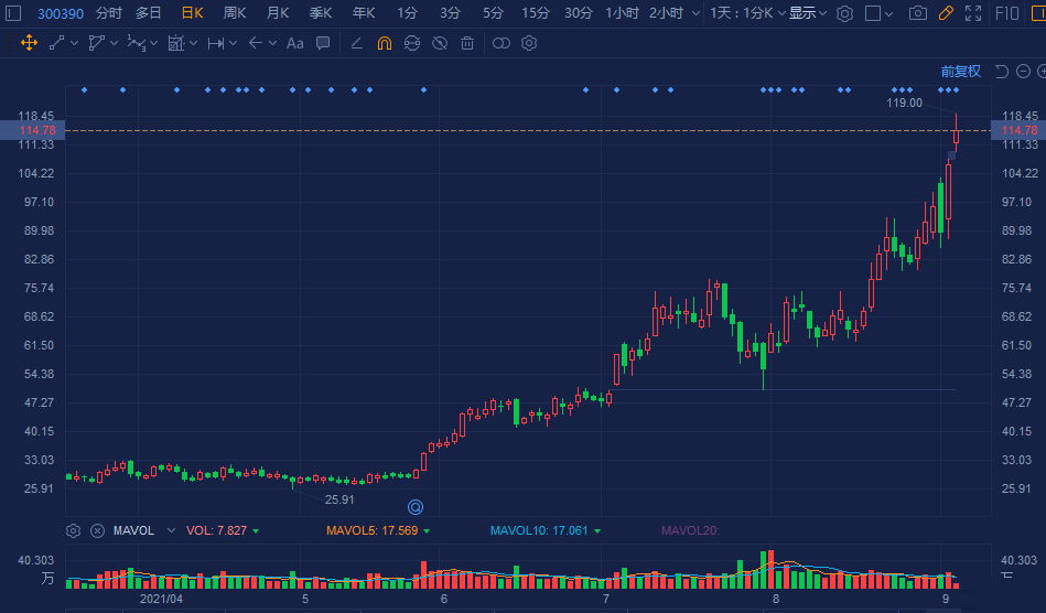 天华超净(300390.SZ)跳空高开,盘初一度拉升涨超11%,高见119元再创历史新高价,总市值达450亿元。