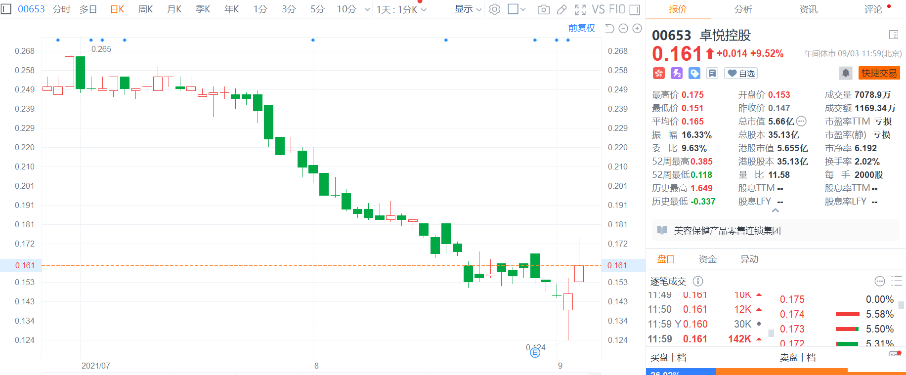 卓悦控股(0653.HK)大涨9.52%,报0.161港元,成交1169万港元,总市值5.66亿港元。
