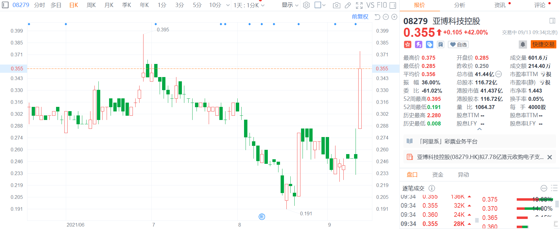 亚博科技控股(8279.HK)高开高走,现大涨42%,报0.355港元,总市值41亿港元。