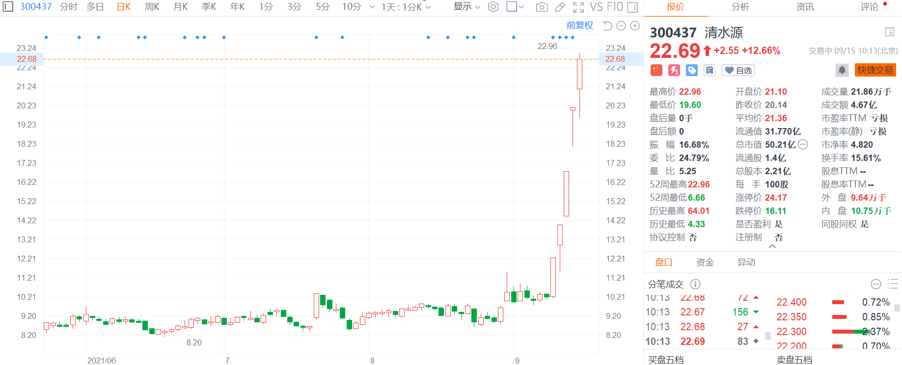清水源(300437.SZ)再度飙升12.66%,近五个交易日累涨逾120%,现报22.69元创四年半以来新高,最新总市值50亿元。