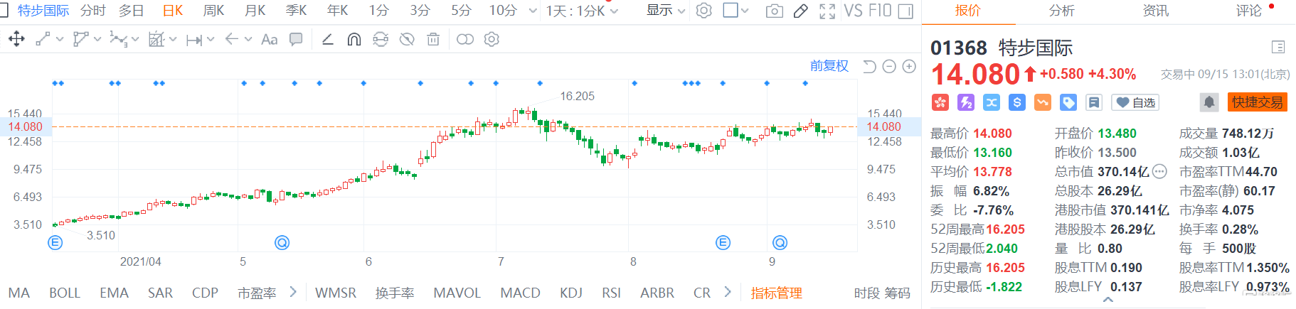 特步国际(1368.HK)股价快速拉升,现报14.08港元,涨幅4.3%,最新总市值370.14亿港元。