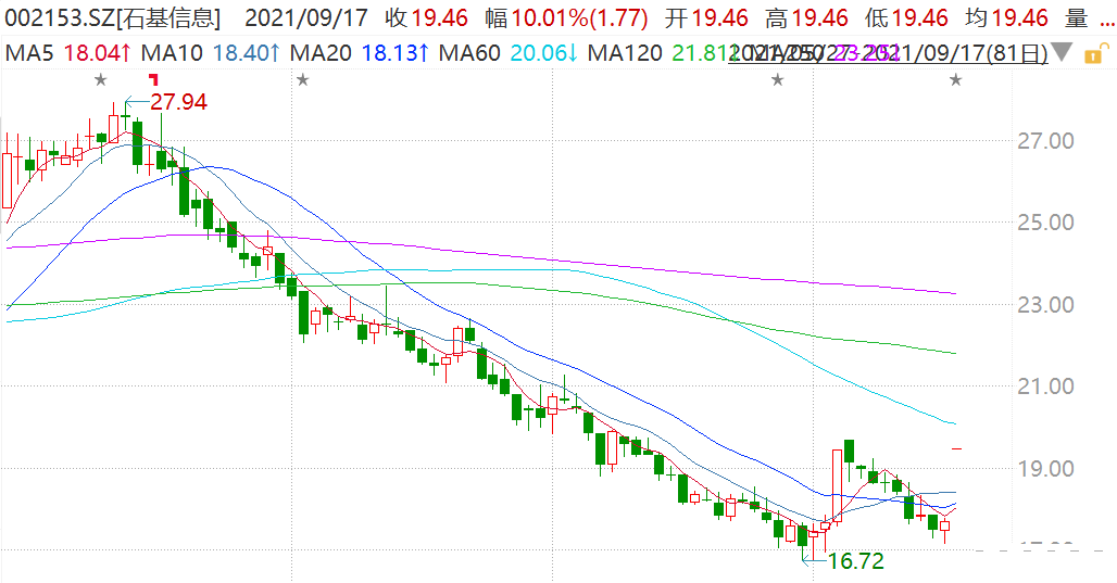 石基信息(002153.SZ)一字涨停报19.46元,市值292亿元。