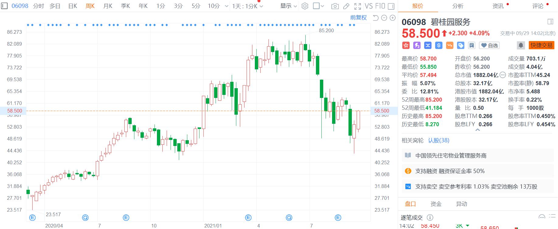 碧桂园服务(6098.HK)涨逾4%,报58.5港元,总市值1882亿港元。