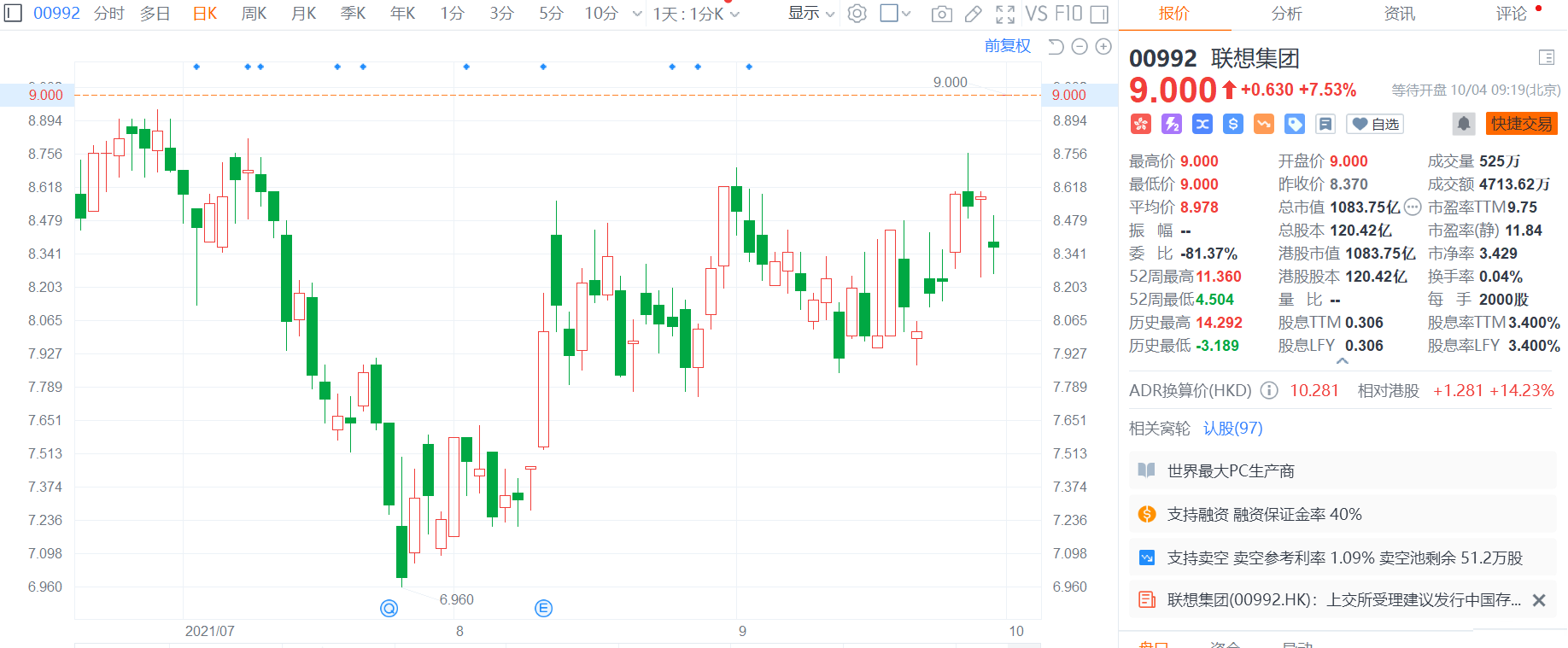 联想集团(0992.HK)高开7.53%,报9港元,股价创近四个月新高,总市值1084亿港元。