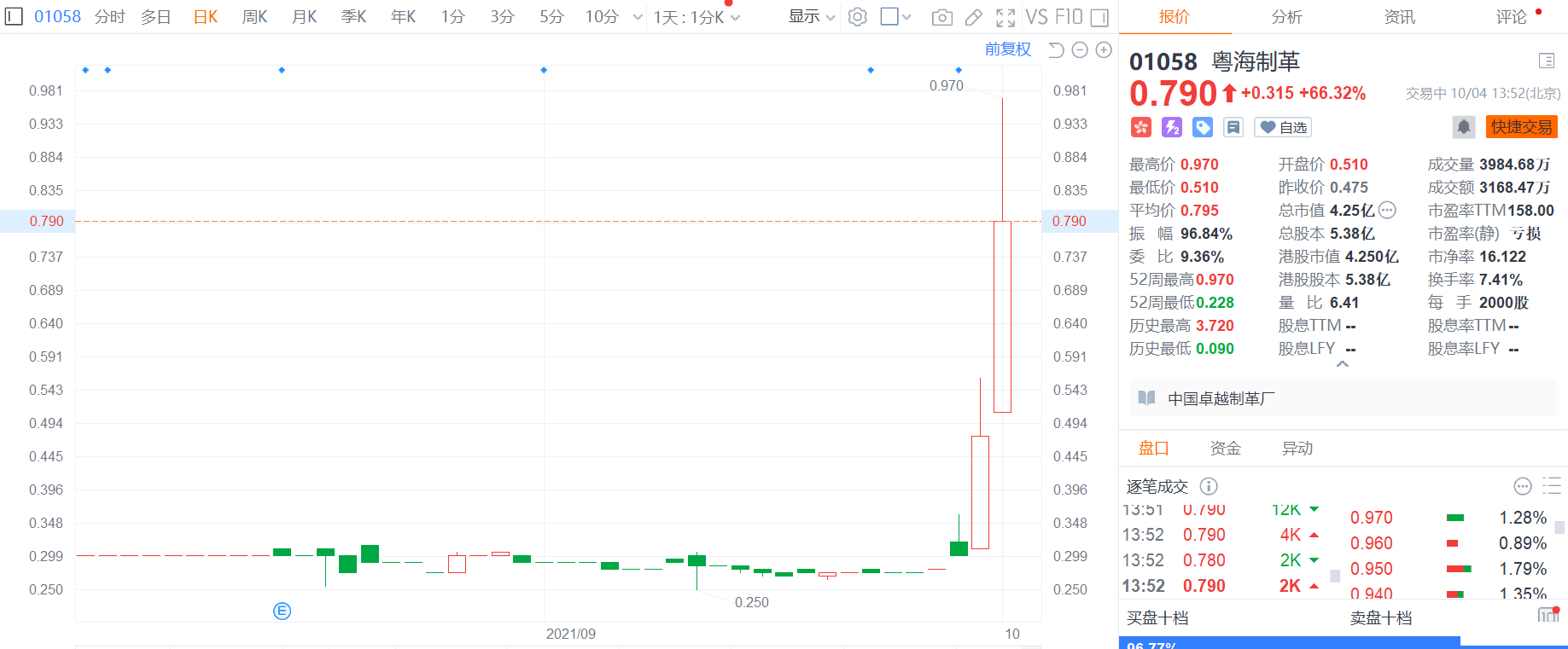 粤海制革(1058.HK)今日逆势大涨66.32%,报0.79港元,近两日累计暴涨逾163%,今日高见0.97港元创逾三年半新高,总市值4.25亿港元。
