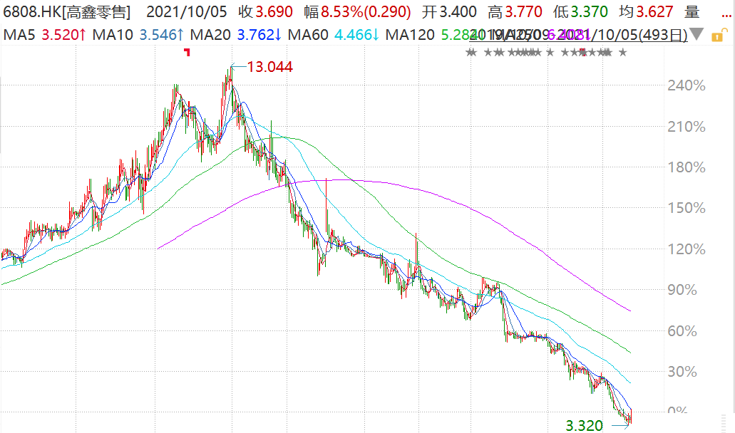 美银证券最新研报虽然下调其目标价,但仍高达7.5港元,相较于目前的价格有翻倍空间。高鑫零售从去年6月份创出的历史最高价13.044港元一路下跌至今(3.32港元),跌幅达74.6%。
