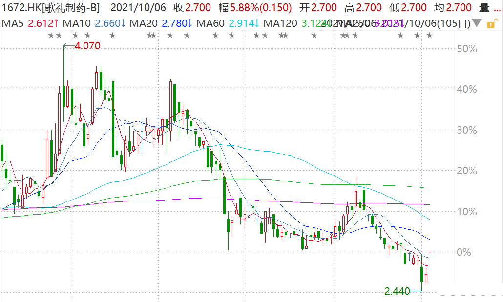 歌礼制药-B(1672.HK)高开5.88%报2.7港元,市值30亿港元。