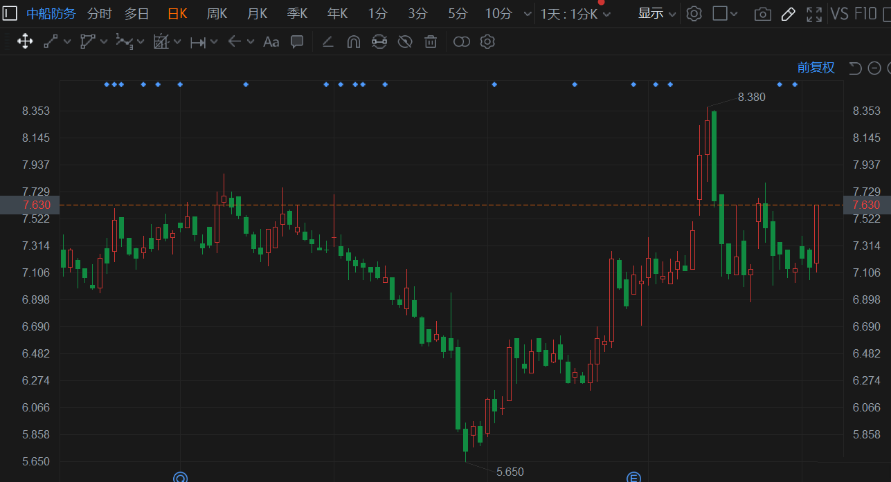 中船防务(0317.HK)涨幅扩大至6.71%,报7.63港元,总市值107.8亿港元。