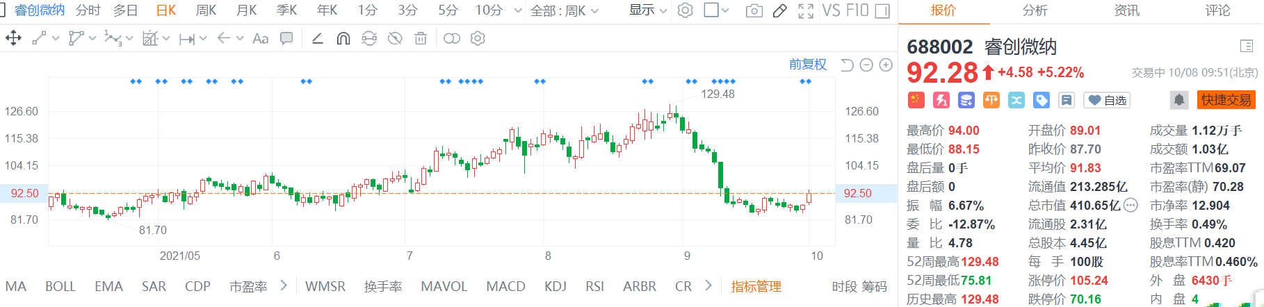 睿创微纳(688002.SH)高位震荡,盘中最大涨幅逾6%,现报92.28元,涨幅5.2%,最新总市值410.65亿。