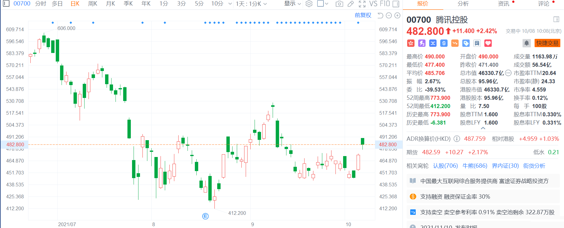 腾讯控股(0700.HK)今早高开近4%,高见490港元,现涨幅收窄至2.42%,总市值46331亿港元。