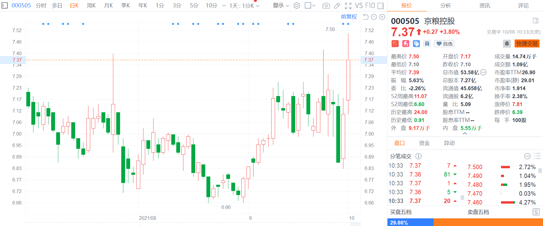 京粮控股(000505.SZ)涨约4%,报7.37元,高见7.5元创近四个月新高,总市值54亿元。