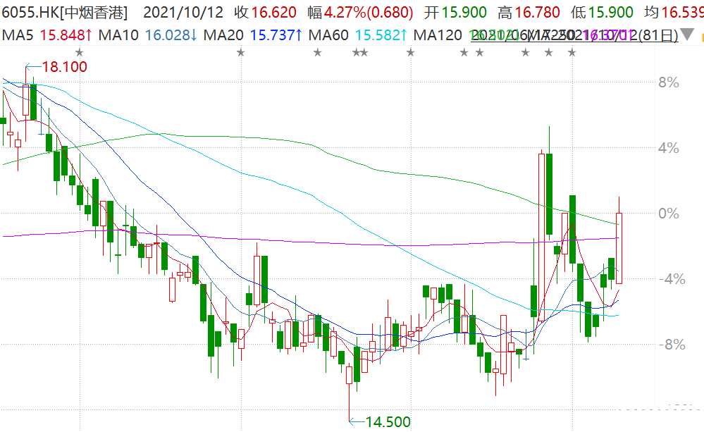 港股整体下跌之际,中烟香港(6055.HK)今日盘中一度逆势涨超5%至16.78港元,创9月27日以来最大涨幅,市值116亿港元。