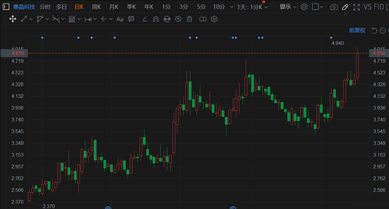 赛晶科技(0580.HK)大幅拉升涨超10%,最高报4.94港元再度刷新历史高价,暂成交7720万港元,总市值达80亿港元。