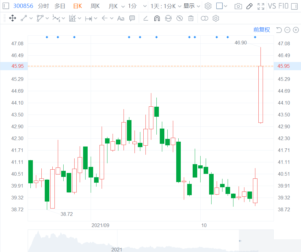 科思股份(300856.SZ)盘中涨16.43%,报46.9元,总市值53亿元。