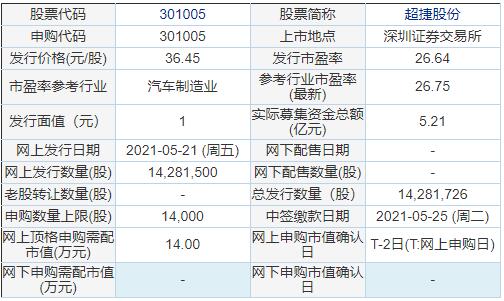 据交易所公告,超捷股份今日申购,申购代码:301005,发行价格:36.45元/股,单一账户申购上限14000股,顶格申购需配市值14.00万元。