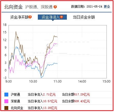 截至午间收盘: 北向资金净流入13.28亿元,其中沪股通资金净流入2.71亿元,深股通资金净流入10.57亿元。