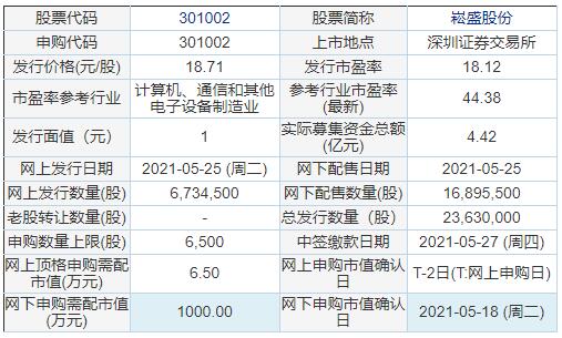 据交易所公告,崧盛股份今日申购,申购代码:301002,发行价格:18.71元/股,单一账户申购上限6500股,顶格申购需配市值6.5万元。