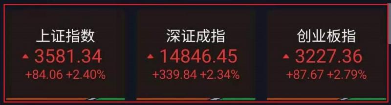 盘面上,白酒、军工、保险、证券、国产软件等板块涨幅居前,农业、碳中和、天然气等板块跌幅前列。截至收盘,上证指数涨2.40%,报3581.04点,深证成指涨2.34%,报14846.43点,创业板指涨2.79%,报3227.40点;