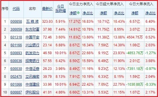 今日沪深两市主力资金净流入排名前5的个股分别为:五 粮 液、东方财富、中国平安、兴业银行、航发动力;主力资金净流出排名前5的个股分别为:格力电器、赣锋锂业、中远海控、京东方A、TCL科技。