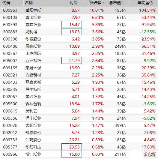 造纸板块今日再度走强,岳阳林纸直线涨停,青山纸业涨超6%,宜宾纸业涨超5%,龙利得、晨鸣纸业、山鹰国际等跟涨。5月份以来,国内造纸行业迎来新一轮涨价潮,包装纸、文化纸等多品类全线上涨:5月1日起,晨鸣文化纸系列产品价格上调200元/吨;包装纸方面,龙头纸企玖龙每隔数天就提价一次,本月内已经提价5次。在这轮涨价潮中,因为纸浆原料价格上涨,造成浆价和纸价的倒挂,让多家造纸企业宣布停机检修停产停工。东北证券日前发布报告称,造纸板块走势渐近曙光,建议把握估值切换的投资机会。