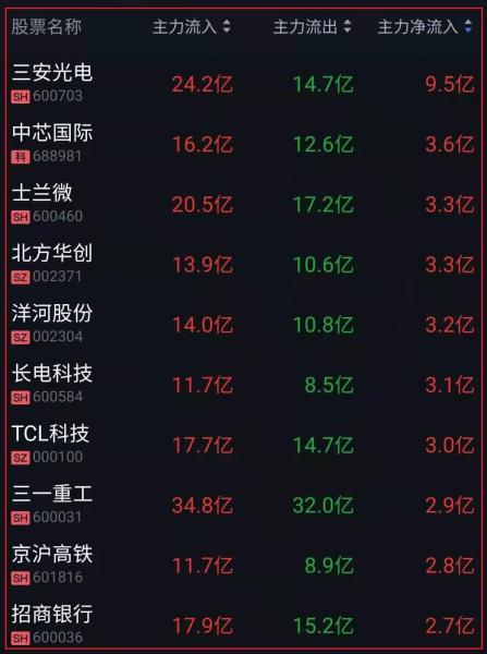 资金净流入十大人气热股: