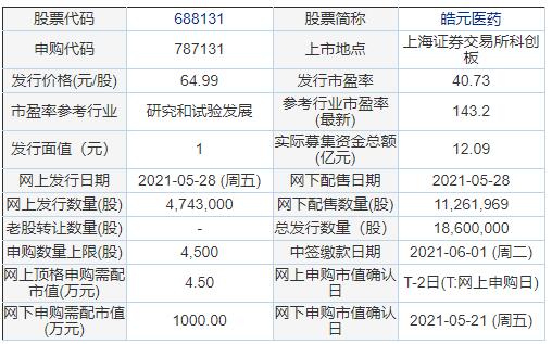 据交易所公告,皓元医药今日申购,申购代码:787131,发行价格:64.99元/股,单一账户申购上限4500股,顶格申购需配市值4.5万元。
