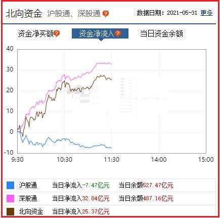 截至午间收盘: 北向资金净流入25.37亿元,其中沪股通资金净流出7.47亿元,深股通资金净流入32.84亿元。