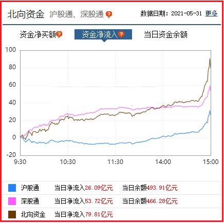 截至收盘: 北向资金净流入79.81亿元,其中沪股通资金净流入26.09亿元,深股通资金净流入53.72亿元。
