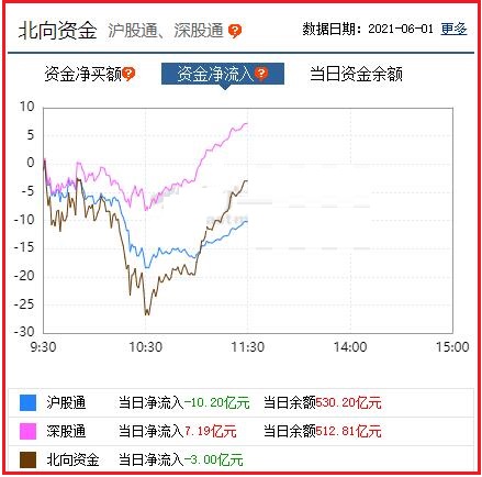 截至午间收盘: 北向资金净流出3.00亿元,其中沪股通资金净流出10.20亿元,深股通资金净流入7.19亿元。