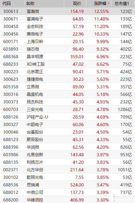 半导体板块午后拉升,上海贝岭涨停,富瀚微、富满电子、全志科技、赛微电子涨超10%,瑞芯微、长电科技、晶丰明源、北京君正、沪硅产业等集体大涨。消息称部分晶圆代工价涨超50%。国信证券研报称,产业链晶圆及封测端游继续保持订单饱满,同时对上游半导体设备端采购周期显现拉长,部分关键设备订单已排到三季度,短期内半导体产能无法快速扩张,因此供需结构紧张进一步加剧。半导体景气度高企,国内制造端并进一步扩产成熟制程,重点关注相关产业链投资机遇。