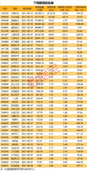 下周是全年解禁压力最大的一周,这些股将面临解禁。近期医美和新能源板块火热,多只个股接连创新高。与此同时,一些高管们开始减持动作,落袋为安。44股中,解禁市值规模最大的是动力电池龙头宁德时代,下周将有9.52亿股上市流通,主要是首发原股东限售股份,解禁市值高达4116.29亿元。有20股的解禁压力较小,解禁市值均不足亿元。先进数通的解禁市值最小,将有48.93万元的市值规模面临解禁。从解禁股数量占总股本的比例来看,天合光能、宁德时代、绿色动力、中天精装、国机重装、三峰环境和燕麦科技的解禁比例居前。