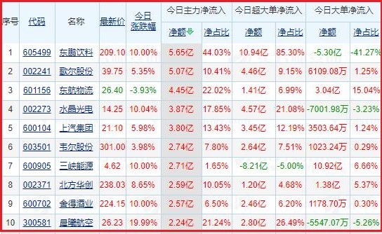 今日沪深两市主力资金净流入排名前5的个股分别为:东鹏饮料、歌尔股份、东航物流、水晶光电、上汽集团;主力资金净流出排名前5的个股分别为:中国平安、润和软件、天齐锂业、复星医药、紫金矿业。