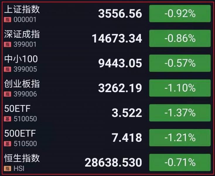 1.A股三大指数开盘涨跌不一,开盘后大幅杀跌,创指、沪指跌幅先后扩大至1%,上证指数跌破箱体下沿,创业板指在5日、10日均线获得支撑,科创50指数逆势上扬。板块方面,连续三日大涨的华为鸿蒙概念股开盘回调,虚拟现实板块持续走强,芯片板块逆势走高。总体而言,市场情绪低迷,个股跌多涨少,赚钱效应较差。截至收盘,沪指跌0.92%,报3556.73点,成交额达4445亿元;深成指跌0.86%,报14673.34点,成交额达5558亿元;创指跌1.1%,报3262.19点,成交额达2247亿元;