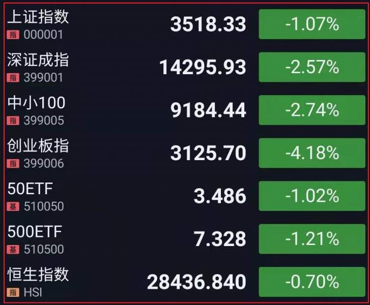 1.A股全天单边下行,华为鸿蒙概念股午后回暖,传智教育(34.860 3.17 10.00%)上演地天板,券商股尾盘拉升,但未能带动市场人气,两市超3000股下跌,短线情绪明显趋冷。截止收盘沪指跌1.07%,深成指跌2.57%,创业板指跌4.18%,创3月8日以来最大跌幅。截至收盘,上证指数跌1.07%,报3518.33点,深证成指跌2.57%,报14295.93点,创业板指跌4.18%,报3125.70点;
